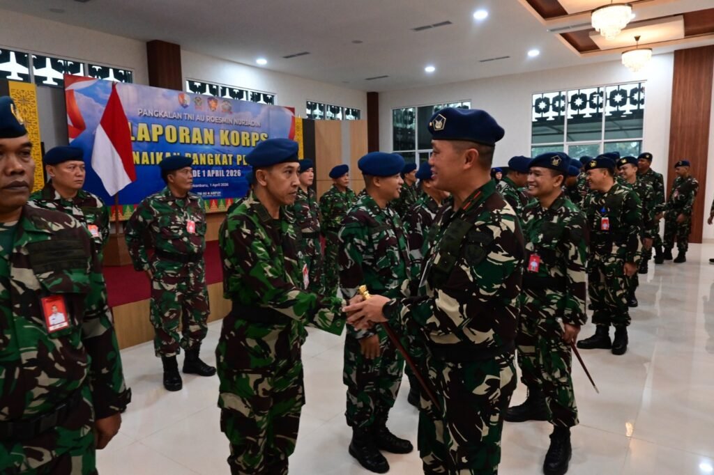 PEKANBARU – Penerangan Lanud Rsn. Komandan Lanud Roesmin Nurjadin, Marsma TNI Abdul Haris, M.M.Pol., M.M.O.A.S., memimpin pelaksanaan Laporan Korps Kenaikan Pangkat Perwira jajaran Lanud Roesmin Nurjadin dan Insub periode 1 April 2026 yang berlangsung dengan khidmat bertempat di Ruang Sadewa VIP Room Pandawa Lanud Roesmin Nurjadin, Rabu (1/4/2026). Kegiatan tersebut dihadiri oleh Danwing Udara 3.1, para Kepala Dinas, Komandan Satuan, serta seluruh perwira jajaran Lanud RSN.